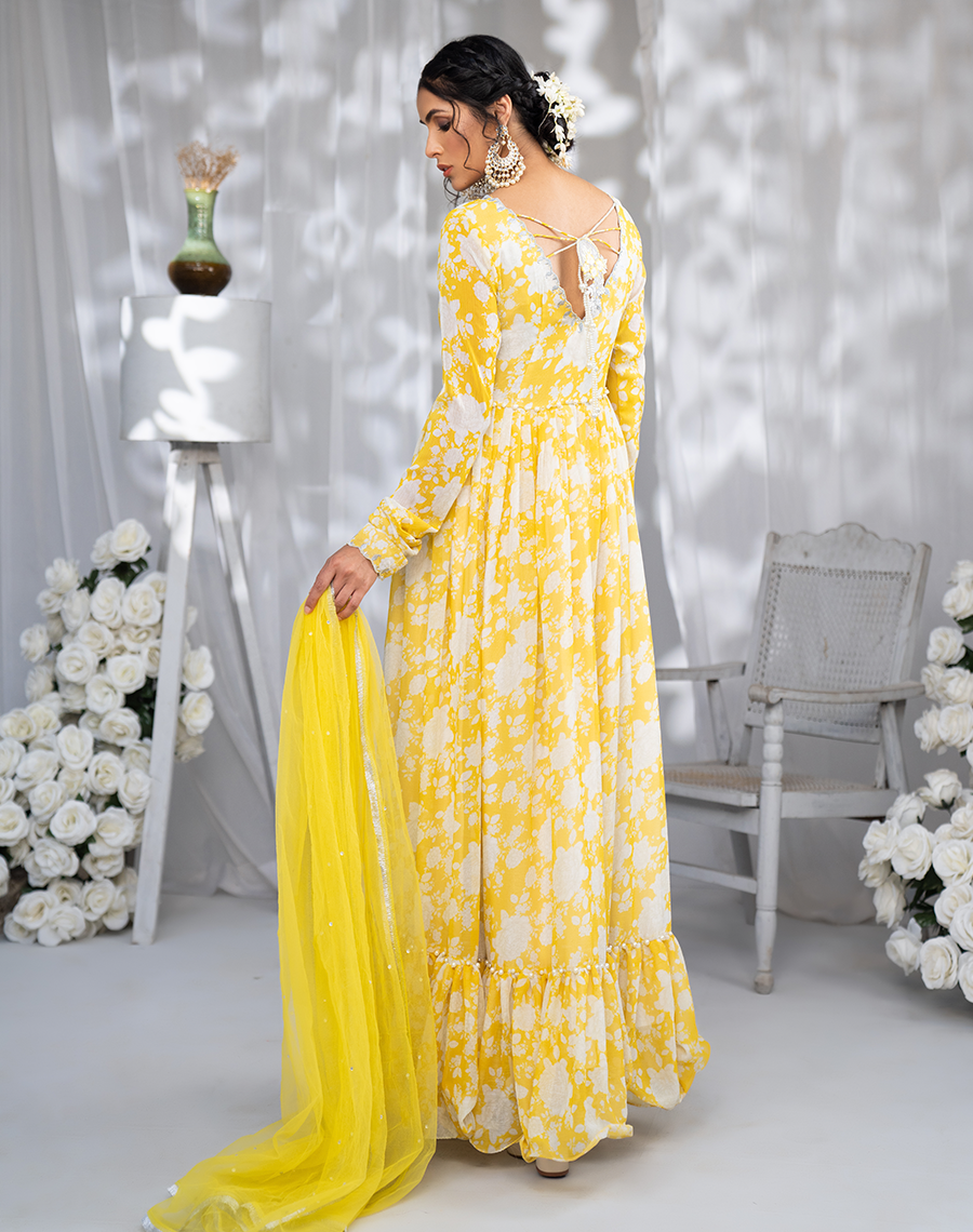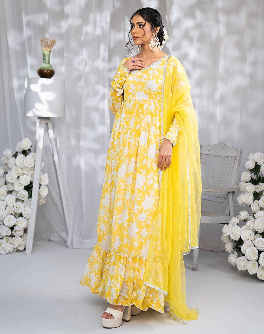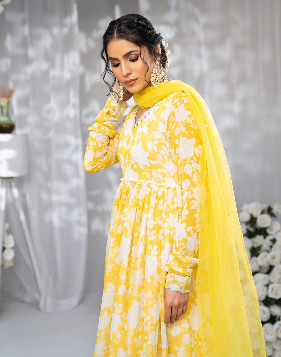 Transform into a snow queen with our Snow Charm Pishwas. The dress boasts churidar statement sleeves and a signature print on chiffon, adorned with intricate silver tilla embroidery and opulent pearl hand embellishment. The pishwas pairs perfectly with straight pants and a net dupatta, which is adorned with Swarovski crystals throughout for a delicate finish. Add traditional kundan jewelry to enhance the regal aura at your next formal event.